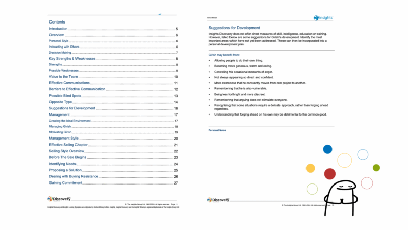 บางคนอาจชอบวางแผนเป็นขั้นตอน มีโครงสร้าง ในขณะที่บางคนจะเชื่อสัญชาตญาณ และใช้แนวคิด “คิดไป ทำไป” Insights จะช่วยให้เราเข้าใจ แนวโน้ม เหล่านี้ และสามารถพัฒนาได้โดยไม่ติดกรอบเรื่องความสามารถ แต่เป็นความเข้าใจถึงความชอบมากกว่าในการแสดงออกทางพฤติกรรม