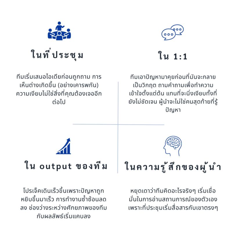 - ความเข้าใจผิด #3: ตีความความเงียบว่าทีมไม่มีศักยภาพ ที่ประชุมเงียบ ไม่มีคำถาม ไม่มีการแสดงความคิดเห็นต่าง ผู้นำสรุปว่าทีมไม่อยากมีส่วนร่วม หรือไม่มีอะไรจะเสนอเพิ่มเติม